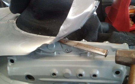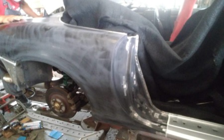 ▼取り付けたクォーターの表面を下地処理します。