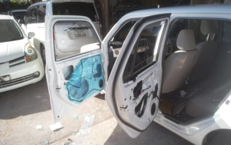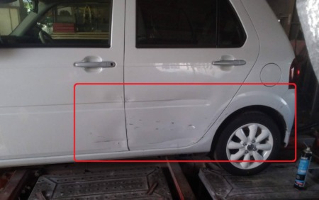 フロントドアからクォーターパネルまでへこみ、キズができています。
