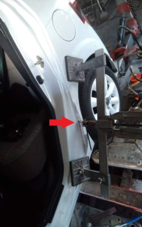 へこみの箇所の塗装をサンダーで削り、専用の工具を使用してへこみを引き出す作業をします。
