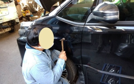 ▼ フェンダーの凹み部分の裏側に当て盤を当ててプレンディングハンマーで凹み箇所を慎重に叩いて凹みを直していきます。