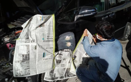 ▼ 塗装面以外の塗料がかかってはまずい個所を専用のシートでマスキングを行います。