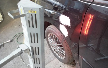 ▼ 修正した箇所にパテを盛り付けます。パテの乾燥を早めるために、赤外線ヒーターで強制乾燥をします。その後研磨を数回繰り返して滑らかに仕上げます。
