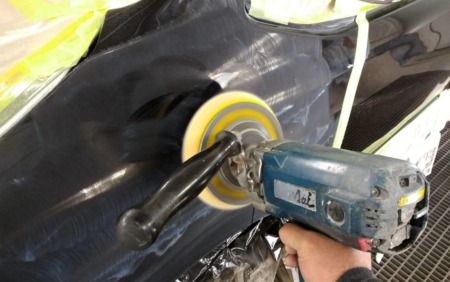▼ 塗装が完了したら全てのマスキングを取払い、最終仕上げに、数種類のバフとコンパウンドを使い分けポリッシャー仕上げで磨きをかけ仕上げていきます。