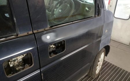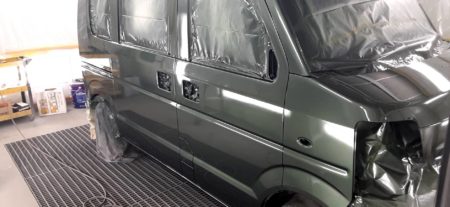 ▼ 今回の塗装はエブリーワゴンの純正色に塗装したいとのご要望でしたので車のカラーコードからその色の調合を調べ、ベテランの塗装職人により塗料の調合を行って塗装します。