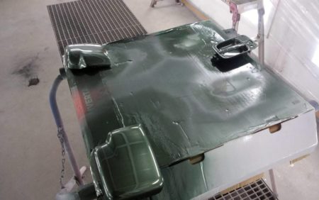 ▼ キズ跡の補修個所に下地処理の為のサフェーサを塗布し、これから塗装に入ります。