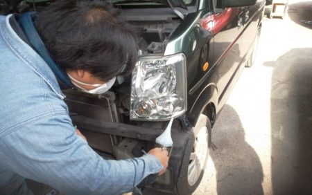 ▼ ヘッドライトを取付けヘッドライトスチーマーのカッブに専用の液体を入れて3~5分程度でブクブクして蒸気が発生するのでノズルの先をヘッドライトにあててその蒸気で満遍なくコーティングしていきます。