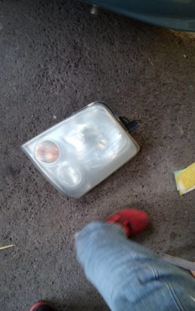 ▼ ヘッドライトのレンズカバーが紫外線や熱で経年劣化を起こして中のバルブも見えない状態になっていました。