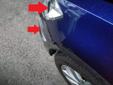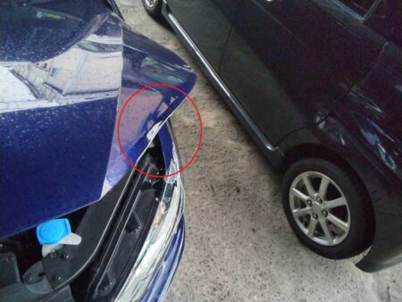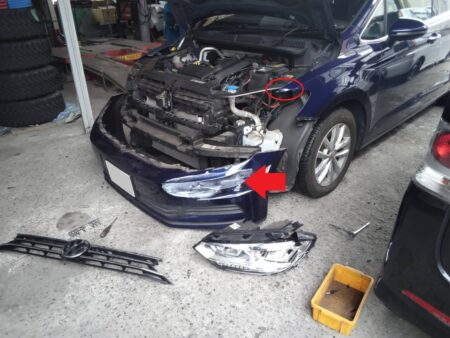 ▼ フロントバンパーが酷く傷ついてしまっている状態でした。フェンダーも内側に曲がっています。