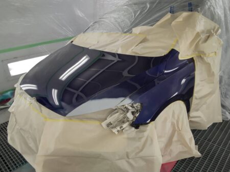 フェンダーとボンネットフード以外をマスキングで養生してから塗装に入ります。