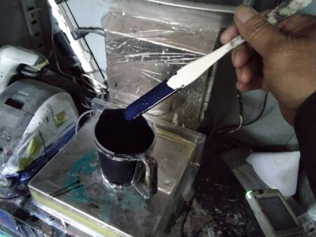 ▼ 塗装に入る前に塗料の調合を車のカラーコードから調べ、デジタル計量器でミリグラム単位で塗料を調合していきます。