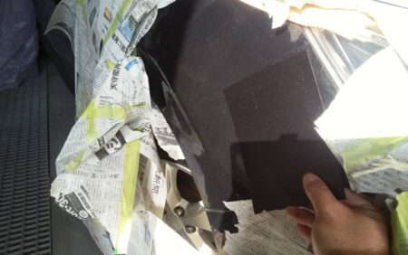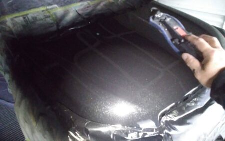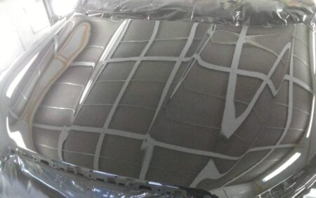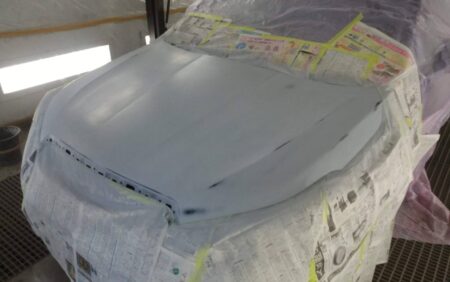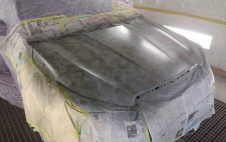今回は飛び石による傷やウォータースポット等を含めてボンネット全体の塗膜をダブルアクションサンダーや紙やすりなどで下地の鉄板がむき出しになるまで塗膜を削り落とし、つるつるに仕上げます。