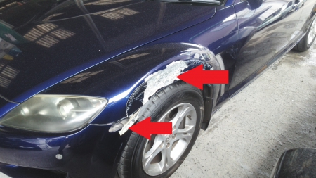 ▼ フェンダーとバンパーの損傷が結構ひどいようです。フェンダーの修理には時間がかかりそうです。