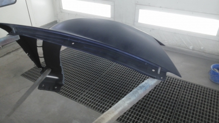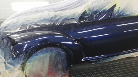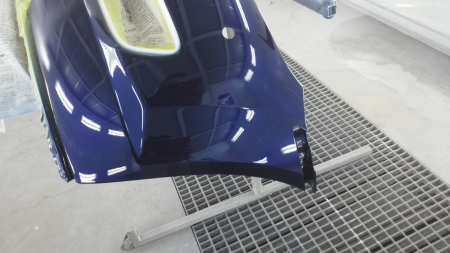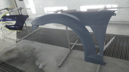 ▼ 新品のフェンダーが納入されて塗装専用ブースで車体同一色に塗装を行います。